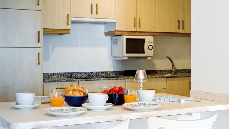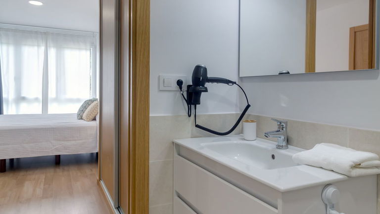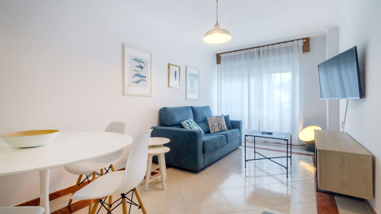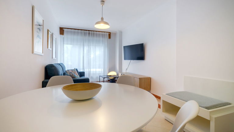 Apartment with 1 bedroom and a sofa bed located in the living room. It has 32-inch TV, full bathroom with hair dryer, fully furnished kitchen with induction hob, microwave, dishwasher, coffee maker, toaster, blender and utensils. It also has a washing machine, dryer, iron, ironing board and bed and bath linen.