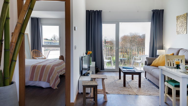 Capacity for 2/4 people distributed in a room with a 150 cm double bed and a sofa bed in the living room. They have private parking, outdoor pool, Wi-Fi, communal washer and dryer, private terrace with furniture, air conditioning and heating. They are equipped with a 40 ' Smart TV in the living room, iron, ironing board, kitchen with induction hob, refrigerator, coffee maker, dishwasher, coffee maker and toaster. They have kitchen utensils and bed and bathroom linen.