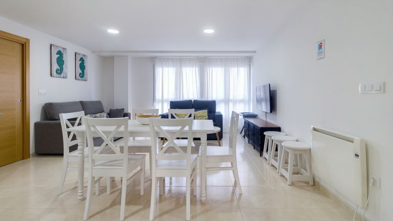 Apartamento con capacidad 8+2 personas distribuidas en 4 habitaciones y sofá cama en salón comedor.