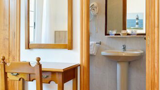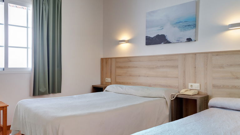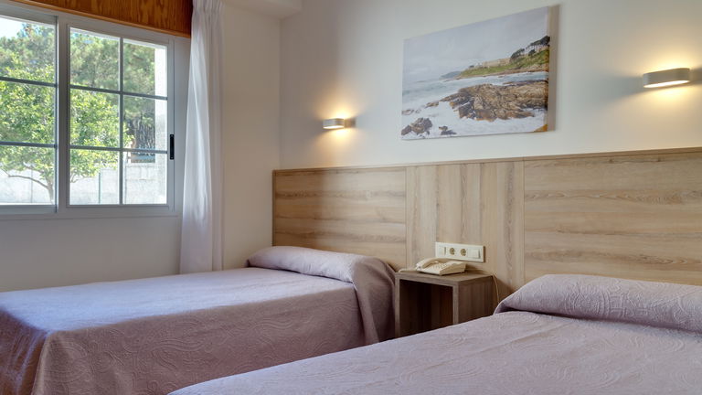 Quarto com 2 camas individuais, decorado de forma simples e equipado com televisão e casa de banho completa com duche.