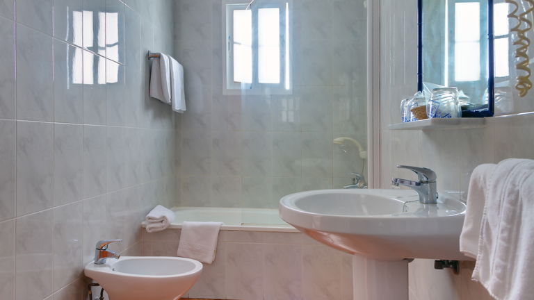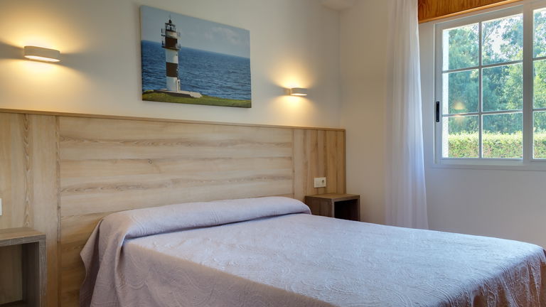 Quarto Standard com cama de casal e cama extra para criança, decoração simples com televisão e casa de banho completa com duche.