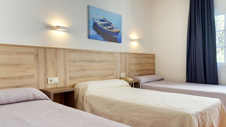 Quarto com 3 camas individuais para adultos ou crianças, decorado de forma simples e equipado com televisão e casa de banho completa com duche.